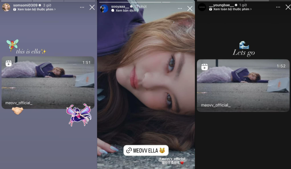 Somi, Jisoo, Taeyang chúc mừng Ella ra mắt trong nhóm nhạc nữ MEOVV. Ảnh: Instagram