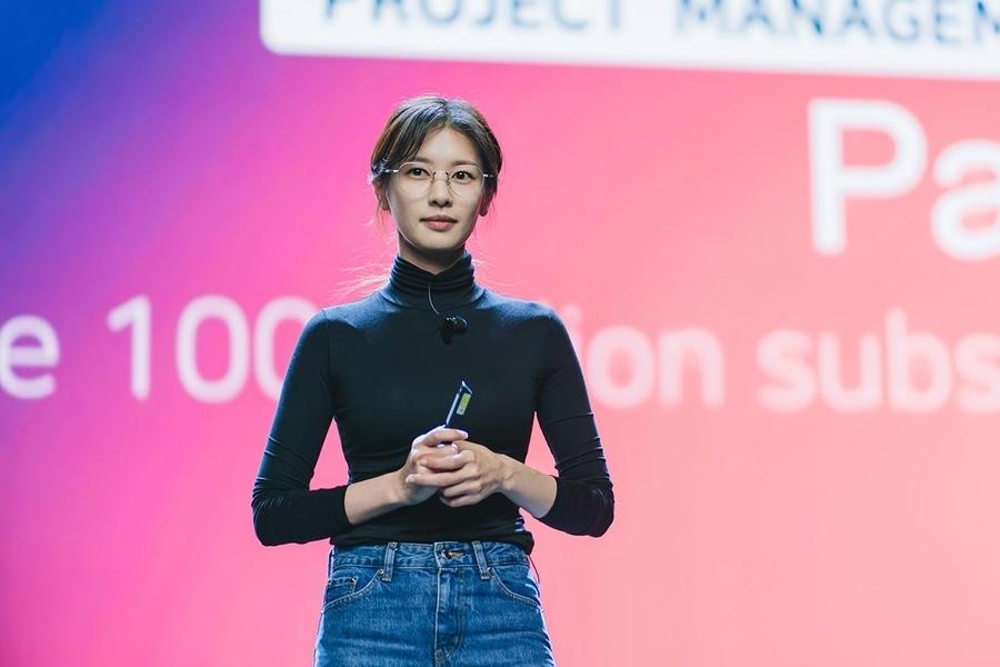 Tạo hình của Jung So Min trong buổi thuyết trình được truyền thông ví von gợi nhớ đến Steve Jobs. Ảnh: Nhà sản xuất