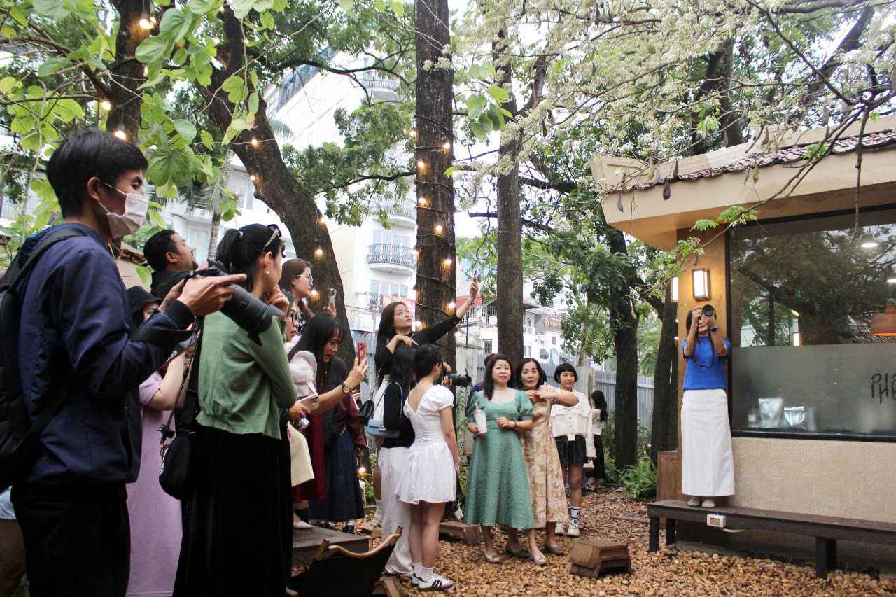 Đại diện quán cà phê cho biết, từ lúc cây hoa sưa nở vào đầu tháng 3, lượng khách tới đây chụp ảnh với hoa tăng đột biến, liên tục từ sáng tới chiều.