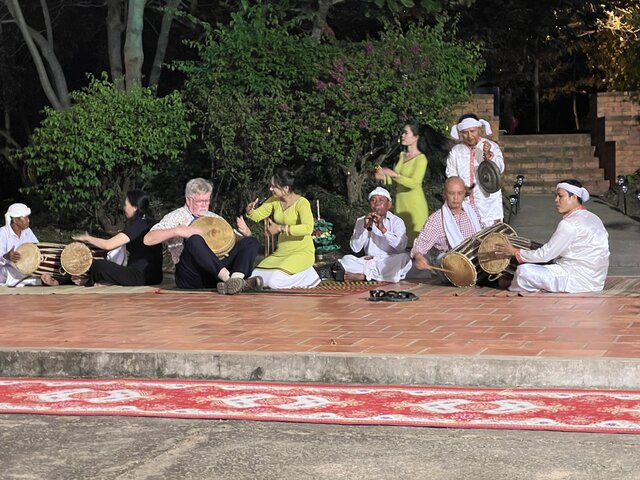 Du khách thưởng thức bữa tối chia tay bên tháp Poshanư vào ngày cuối cùng của chuyến đi. Ảnh: Nguyễn Thành Nam