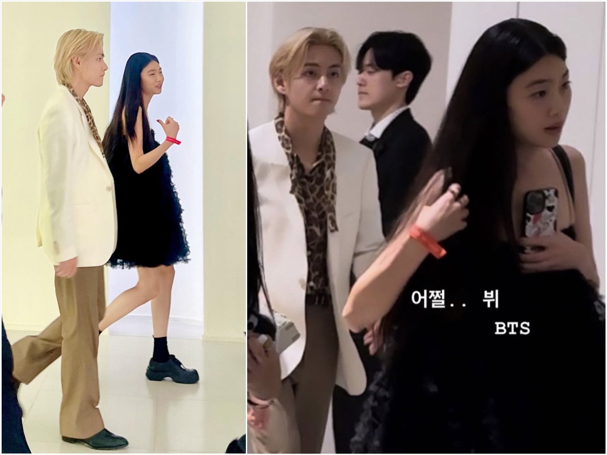 Trong đó, một video cho thấy, Hanni, Minji của nhóm NewJeans được xếp ngồi cùng bàn tiệc với Jisoo Blackpink, V BTS và hai diễn viên Jung Hyo Yeon, Lee Soo Hyuk. Cũng có video ghi lại khoảnh khắc V, Jung Hyo Yeon và Hanni, Minji đi chung.