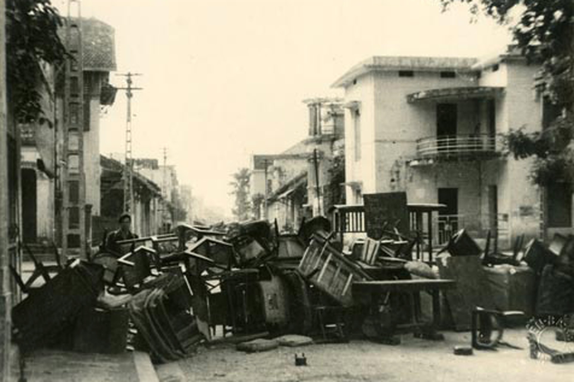 Chướng ngại vật được dựng lên cuối phố Huyền Trân Công Chúa, Hà Nội tháng 12-1946. Ảnh: Tư liệu