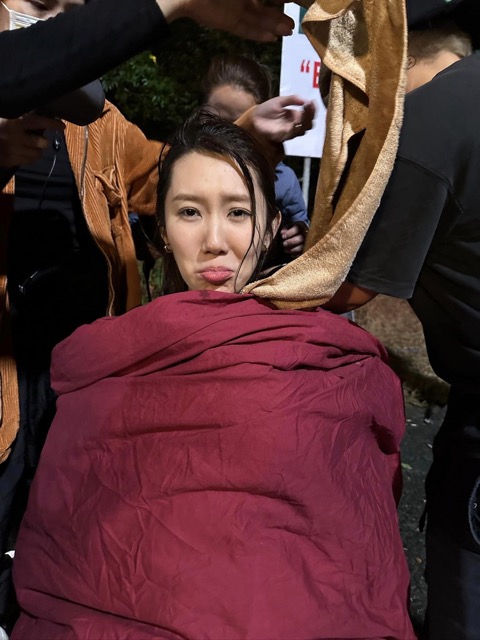 “Cảnh tai nạn quay đúng vào ngày 31.12, lịch ngay giao thừa. Khúc nằm trên cáng, tôi run cầm cập mà phải diễn bất động. Quần áo khô là sai raccord (tức sai set quay), phải ướt, cát và máu, xả 2 bồn nước giả mưa lên người từ tối tới sáng. Không chỉ tôi mà anh Jun Phạm, chị Thúy Ngân cũng bị trúng gió, tím người. Ai cũng vác cái mền ra ngã tư đắp” - cô nói.