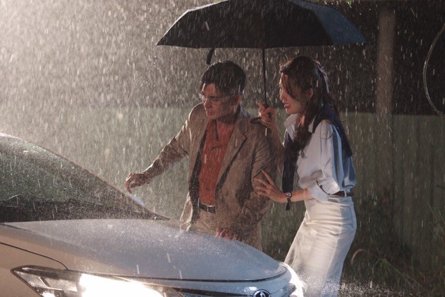 Jun Phạm và Thúy Ngân dầm mưa để quay phim. Ảnh: VieON
