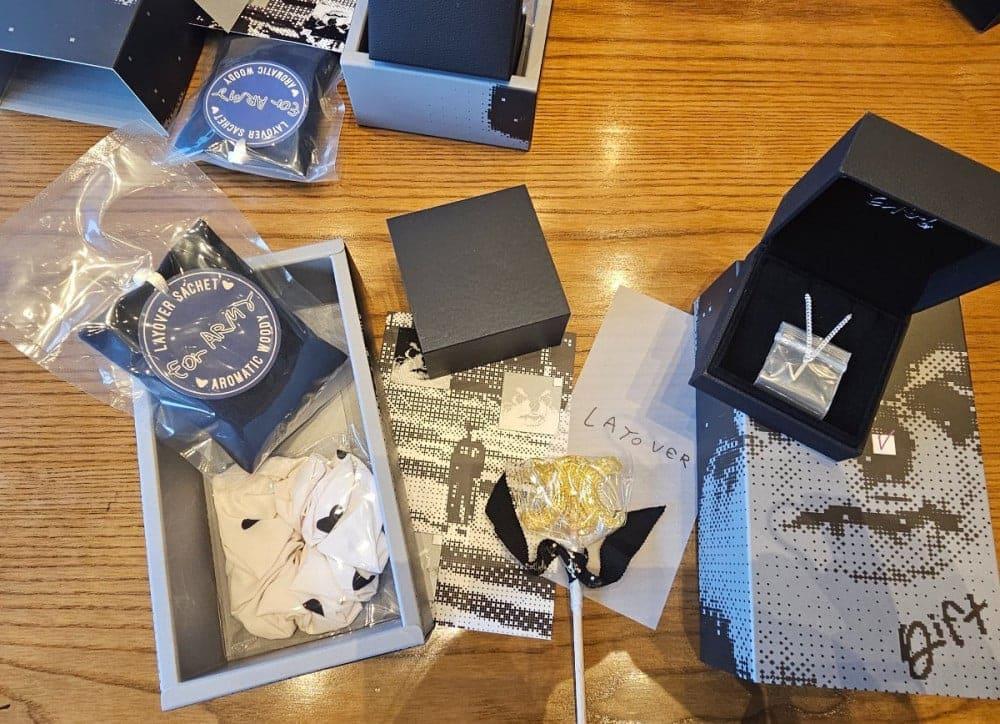 Trong hộp quà được người hâm mộ tiết lộ có một chiếc vòng tay, dây buộc tóc, kẹo mút hình logo Celine, túi thơm, cùng nhiều tấm card, ảnh thẻ với chủ đề xoay quanh album “Layover" của V vừa phát hành.