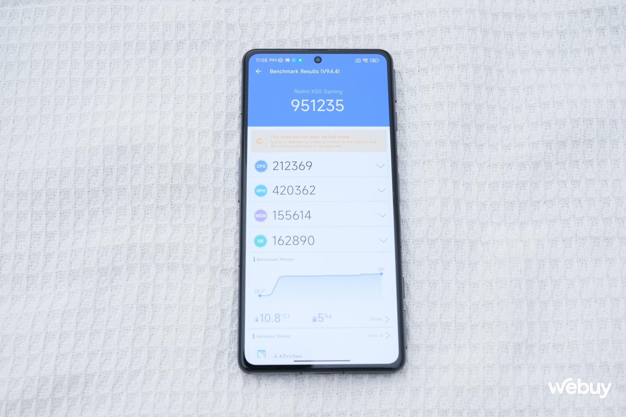 Chấm điểm hiệu năng Redmi K50 Gaming với phần mềm AnTuTu Benchmark v9 và Geekbench 5, máy cho điểm số khá ấn tượng tuy có gặp một chút vấn đề về nhiệt. Redmi K50 Gaming trang bị một hệ thống tản nhiệt tương đối chất lượng nên có thể toả nhiệt nhanh hơn trong quá trình chơi game