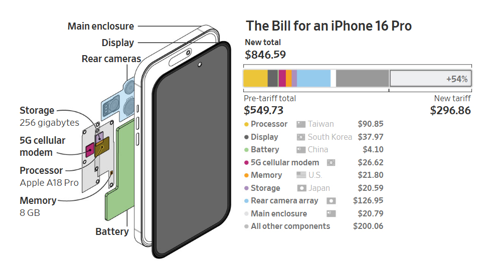 Vấn đề là giờ đây Mỹ lại có mức thuế mới đối với hàng hóa từ Trung Quốc - tổng cộng 54%. Với mức thuế mới, chi phí sẽ tăng lên khoảng 850 USD, thành ra biên lợi nhuận sẽ giảm đáng kể nếu Apple không tăng giá bán. Và bạn không thể trở thành một công ty nghìn tỷ nếu bán hàng theo giá vốn.