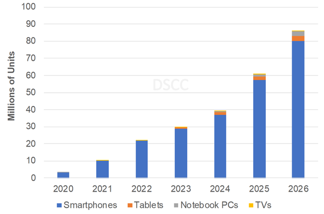 DSCC ước tính sẽ có đến 86 triệu thiết bị màn hình gập vào năm 2026, không chỉ smartphone mà bao gồm cả máy tính bảng, TV, laptop. Khi có nhiều công ty tham gia, Samsung có thể sẽ mất đi một phần thị trường. Tuy nhiên, DSCC tin rằng gã khổng lồ công nghệ Hàn Quốc vẫn có thể tiếp tục thống trị nhờ tầm ảnh hưởng đáng kể của họ.