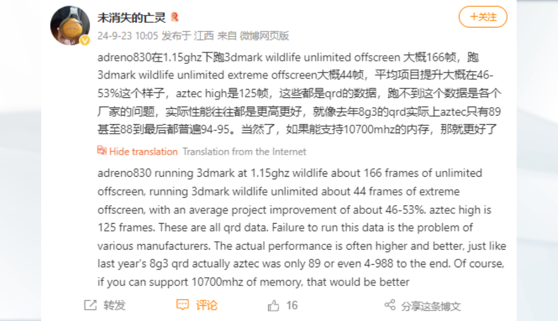 Thông tin rò rỉ này đến từ người dùng Weibo có tên Undying Spirits, người này đã chia sẻ kết quả bài test 3DMark Wild Life của Snapdragon 8 Gen 4. Kết quả cho thấy GPU Adreno 830 của Snapdragon 8 Gen 4 đạt 1.15GHz và đạt 166 khung hình trong bài kiểm tra Wild Life offscreen của 3DMark, cùng với khoảng 44fps trong Wild Life Extreme Unlimited. Điểm số này là mức cải thiện đáng kể từ 46-53% so với Snapdragon 8 Gen 3.