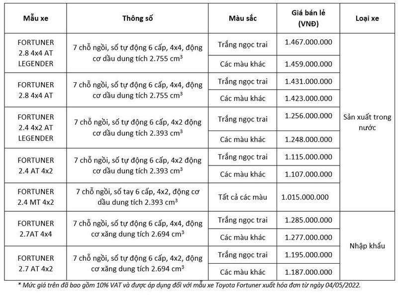 Toyota Fortuner 2022 sẽ chính thức có mặt tại hệ thống đại lý Toyota trên toàn quốc từ ngày 04/05/2022 với mức giá bán lẻ như sau: