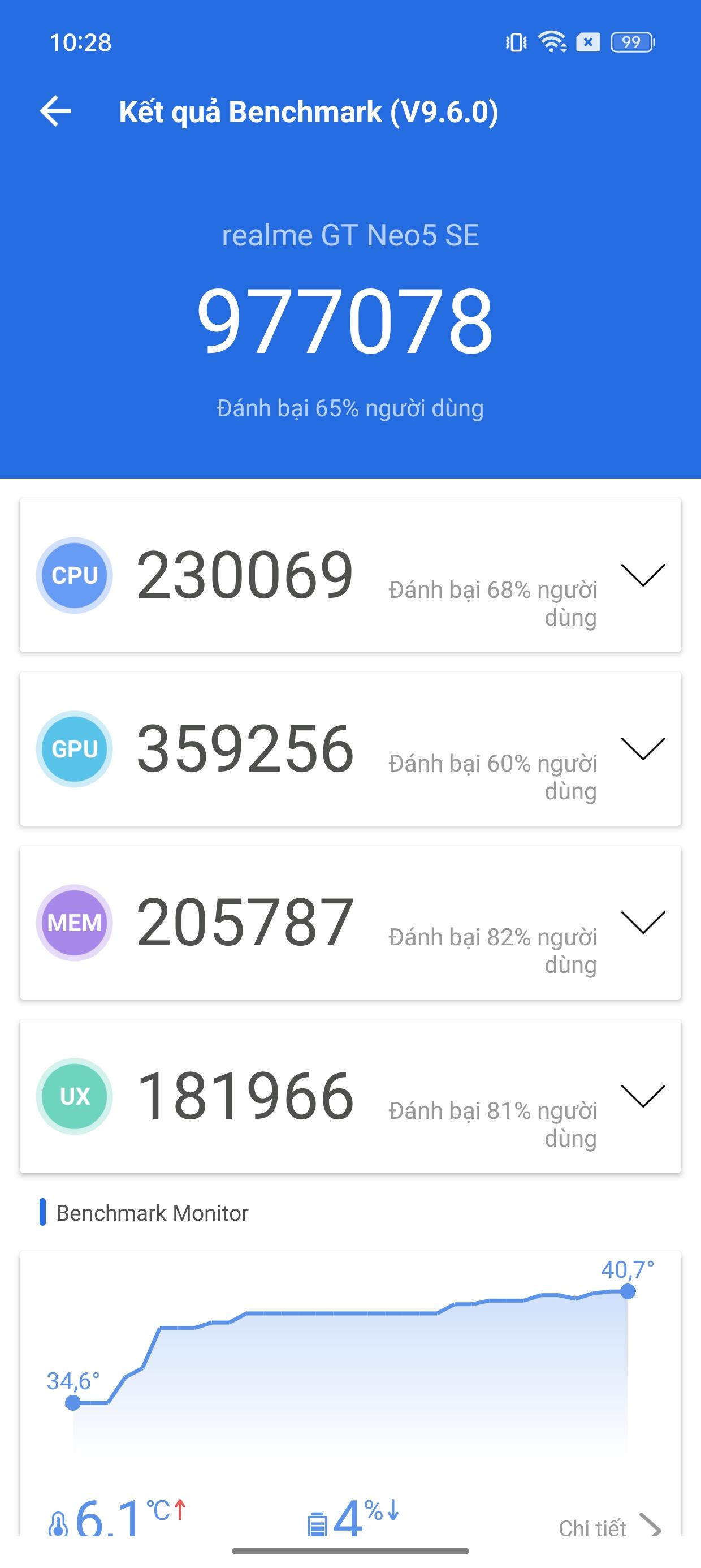 Điểm hiệu năng realme GT Neo5 SE khi chấm bằng phần mềm AnTuTu Benchmark 9 cũng như Geekbench 6