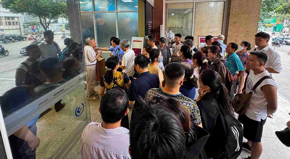 Người dân xếp hàng mua vàng tại một chi nhánh ngân hàng trên đường Láng Hạ (Hà Nội). Ảnh: PHẠM TUẤN