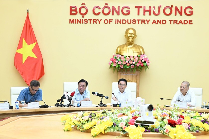 | Bộ trưởng Bộ NN&PTNT và Bộ trưởng Bộ Công Thương (lần lượt thứ 2 và thứ 3 từ trái qua) tại cuộc họp. (Ảnh: PV). |