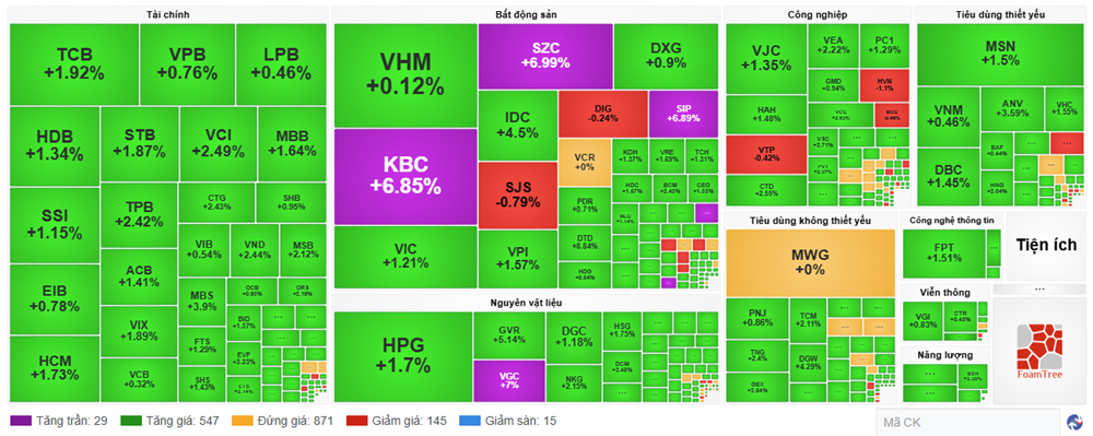 Sắc xanh phủ sóng bảng điện tử với 576 mã tăng (gồm 29 mã tăng trần). Ngược lại, toàn thị trường chỉ ghi nhận 160 mã giảm (gồm 15 mã giảm sàn) và 871 mã giữ tham chiếu.