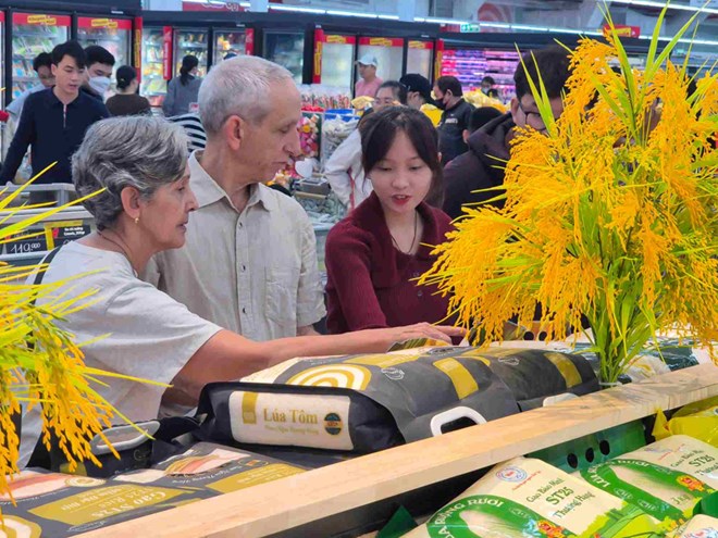 Khách hàng nước ngoài đang tìm hiểu và lựa chọn các sản phẩm gạo đặc sản Việt Nam tại một siêu thị ở Hà Nội. Ảnh: Phan Anh