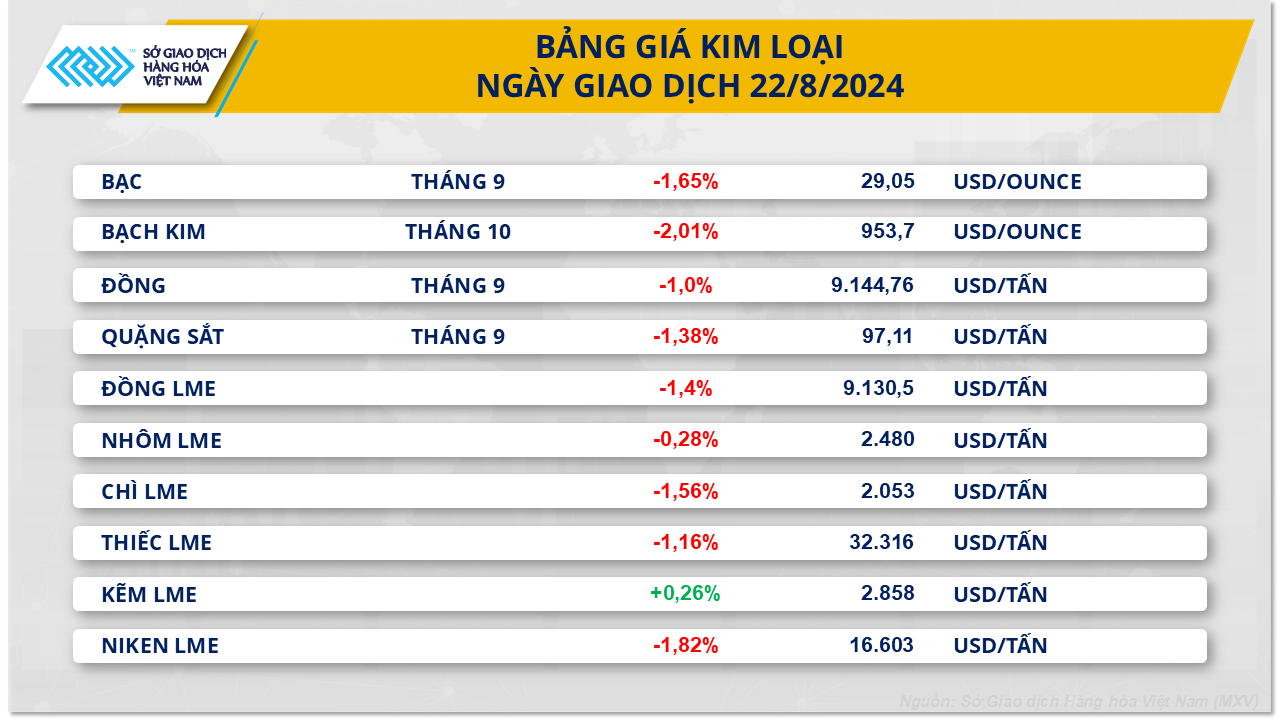 Bảng giá kim loại ngày 22-8. Nguồn: MXV