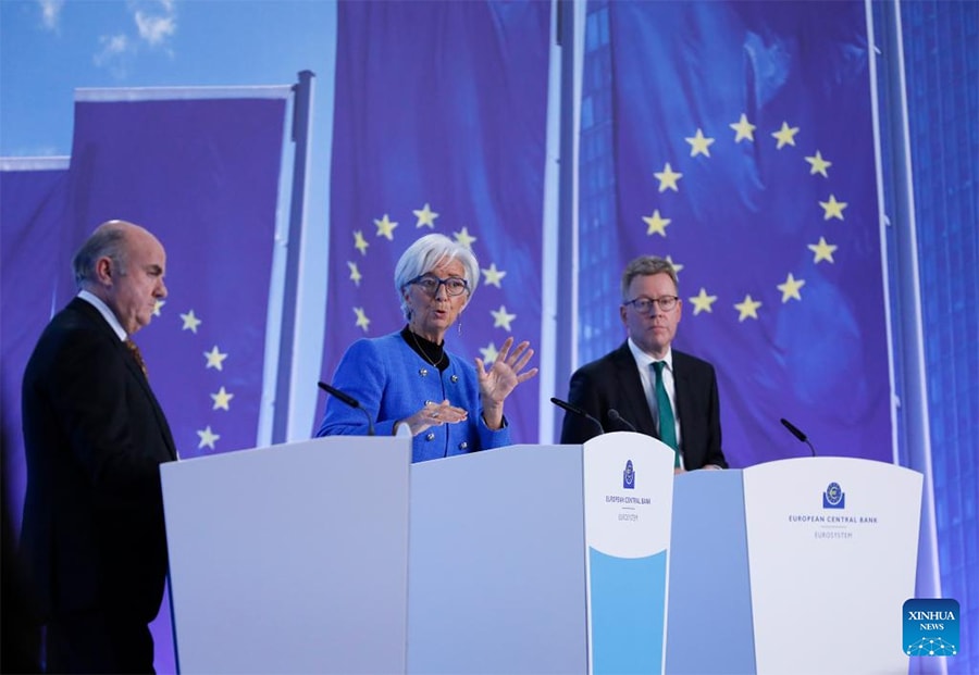 Chủ tịch ECB Christine Lagarde (giữa) thông báo cắt giảm lãi suất.