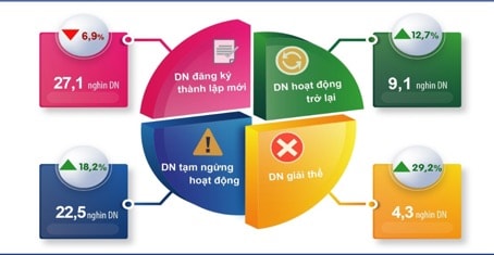 Cùng với đó, 9,1 nghìn doanh nghiệp hoạt động trở lại, tăng 12,7% so với cùng kỳ năm 2023. Trong khi 22,5 nghìn doanh nghiệp đăng ký tạm ngừng hoạt động, tăng 18,2% và hơn 4,3 nghìn doanh nghiệp giải thể, tăng 29,2% so với cùng kỳ năm trước.