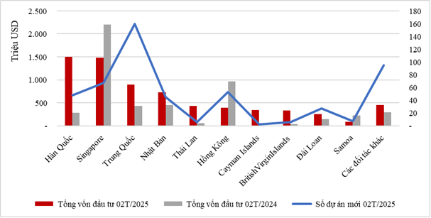Trong 67 quốc gia và vùng lãnh thổ có đầu tư tại Việt Nam trong hai tháng đầu, Hàn Quốc dẫn đầu với tổng vốn đầu tư hơn 1,5 tỷ USD, chiếm hơn 21,7% tổng vốn đầu tư, gấp 5,4 lần cùng kỳ. Singapore đứng thứ hai với hơn 1,48 tỷ USD, chiếm 21,4% tổng vốn đầu tư, giảm 32,9% so với cùng kỳ. Tiếp theo là Trung Quốc, Nhật Bản, Thái Lan,…