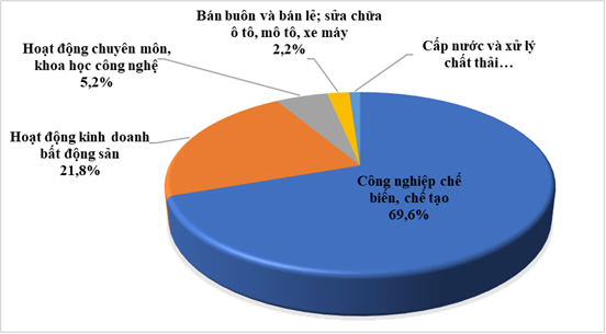 Xét về số lượng dự án, công nghiệp chế biến, chế tạo là ngành dẫn đầu về số dự án mới và (chiếm 37,8%) và số lượt dự án điều chỉnh vốn (chiếm 61,7%). Ngành bán buôn, bán lẻ dẫn đầu về số giao dịch góp vốn mua cổ phần (chiếm 42,9%).