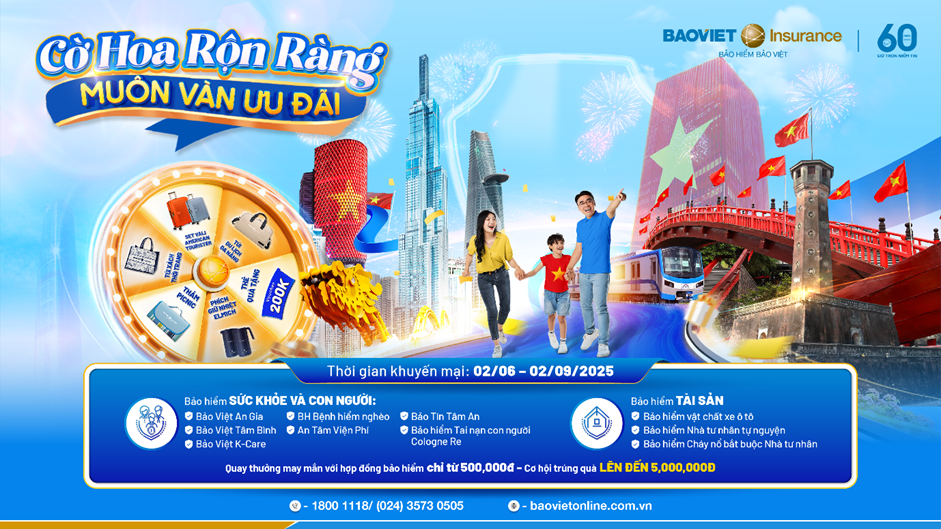 Đặc biệt, trong không khí hân hoan của những ngày hè lịch sử khi đất nước hướng tới Đại lễ 80 năm Quốc khánh nước Cộng hòa xã hội chủ nghĩa Việt Nam (2/9/1945 - 2/9/2025), Bảo hiểm Bảo Việt chính thức triển khai chương trình khuyến mại đặc biệt mang tên “Cờ hoa rộn ràng – Muôn vàn ưu đãi” diễn ra từ ngày 2/6 - 2/9/2025 dành cho tất cả các khách hàng tham gia mới các chương trình bảo hiểm tại Bảo hiểm Bảo Việt.