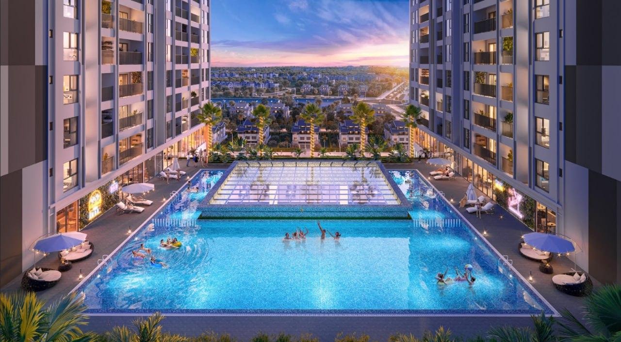 Cư dân cũng có thể tận hưởng hệ thống tiện ích cao cấp như bể bơi tầng không, phố thương mại, sân chơi cho trẻ, sân thể thao ngoài trời, thư viện và phòng sinh hoạt cộng đồng.
