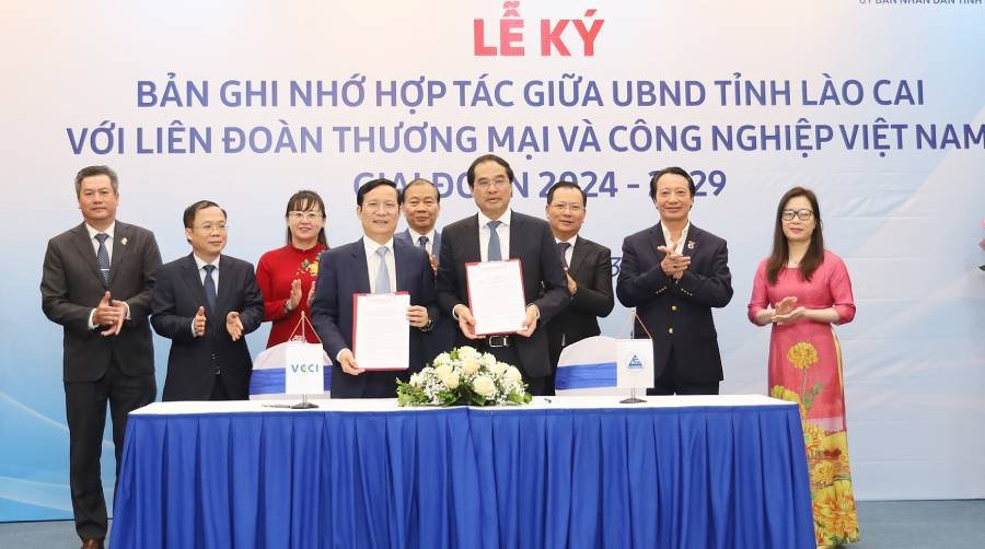 Chiều ngày 28/3, VCCI và UBND tỉnh Lào Cai đã tổ chức lễ ký Bản ghi nhớ hợp tác giai đoạn 2024 - 2029. Bản ghi nhớ giữa UBND tỉnh Lào Cai và VCCI về hợp tác triển khai cải thiện môi trường đầu tư kinh doanh, hỗ trợ doanh nghiệp giai đoạn 2024 - 2029, sẽ tập trung vào 3 nội dung trọng tâm được hai bên thống nhất đẩy mạnh hợp tác, đó là: Tỉnh Lào Cai và VCCI hợp tác triển khai toàn diện công tác cải thiện môi trường đầu tư kinh doanh, nâng cao năng lực cạnh tranh giai đoạn 2024-2029; hợp tác cùng thực hiện các hoạt động hướng tới đạt được các mục tiêu quan trọng về kinh tế - xã hội; hợp tác để triển khai các hoạt động hỗ trợ và thúc đẩy doanh nghiệp phát triển.