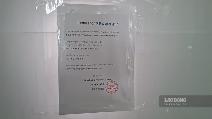 Theo ghi nhận của phóng viên, trụ sở Công ty TNHH Hitech Vina thông báo đóng cửa từ ngày 6.6.2024 và hiện không có người làm việc.