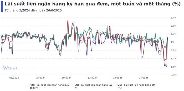 Trên thị trường liên ngân hàng, lãi suất kỳ hạn qua đêm có xu hướng tăng, bắt đầu ở mốc 1,62% vào phiên đầu tuần và tăng dần qua các phiên lên 4,37% tại ngày 26/6. Tổng cộng trong tuần qua, lãi suất liên ngân hàng tăng 2,75 điểm %.