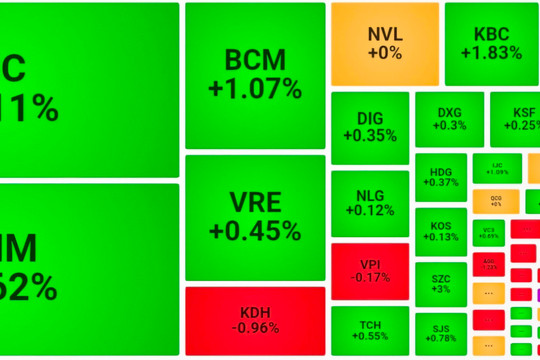 Phiên này, thị trường tăng điểm tốt chủ yếu nhờ vào nhóm cổ phiếu lớn. Trong 10 mã có mức vốn hóa lớn nhất thị trường thì có tới 8 mã tăng giá. Toàn sàn ghi nhận 298 mã đi lên, 113 mã đi xuống. Tại nhóm VN30, số mã tăng giá chiếm áp đảo với 23 mã tăng, mã duy nhất giảm là GAS.
