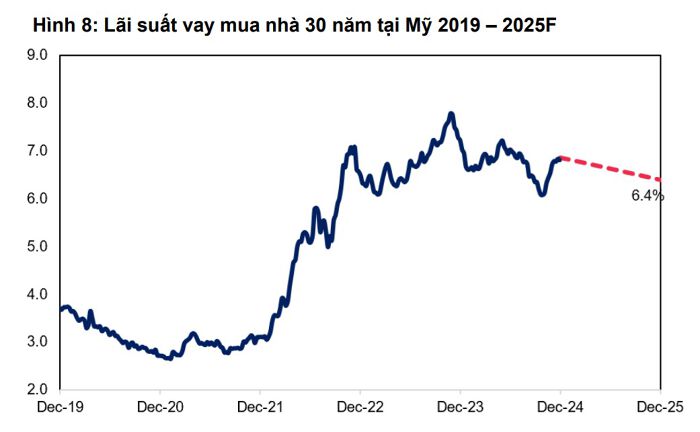 Cụ thể, theo báo cáo, năm 2025, Mỹ tiếp tục là thị trường triển vọng của xuất khẩu gỗ, đặc biệt khi nhu cầu nhà ở của nước này phục hồi mạnh mẽ hơn trong năm nay.Theo dự phóng của Hiệp hội Ngân hàng Thế chấp (MBA), việc FED tiếp tục thực hiện kế hoạch cắt giảm lãi suất trong năm 2025 sẽ tạo dư địa cho các ngân hàng giảm lãi suất cho vay mua nhà 30 năm tại Mỹ. MBS cho rằng thị trường nhà ở tại Mỹ sẽ phục hồi, số nhà mới bán được sẽ cải thiện hơn vào nửa cuối năm 2025, qua đó thúc đẩy nhu cầu tiêu thụ gỗ và sản phẩm gỗ.