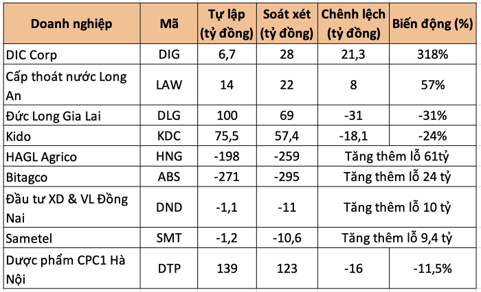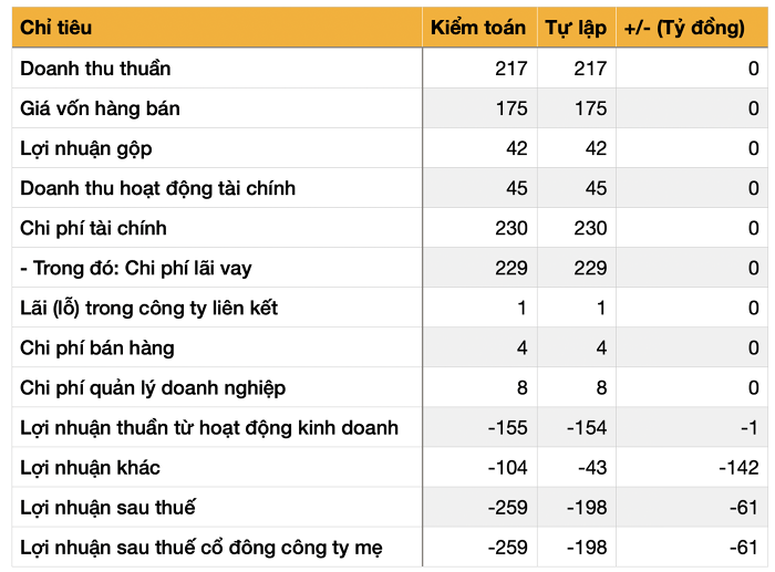 Trừ đi khoản thu nhập khác thì khoản lỗ khác của doanh nghiệp tăng từ 43 tỷ ở báo cáo tự lập lên 104 tỷ sau soát xét.