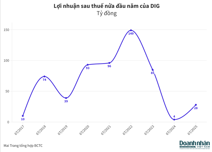 Năm 2025, DIG đặt mục tiêu doanh thu hợp nhất đạt 3.500 tỷ đồng, lợi nhuận trước thuế đạt 718 tỷ đồng. Với mức doanh thu 425 tỷ đồng và lợi nhuận trước thuế 38 tỷ đồng đạt được trong 6 tháng đầu năm, công ty mới hoàn thành 12% kế hoạch doanh thu và 5,3% kế hoạch lợi nhuận.