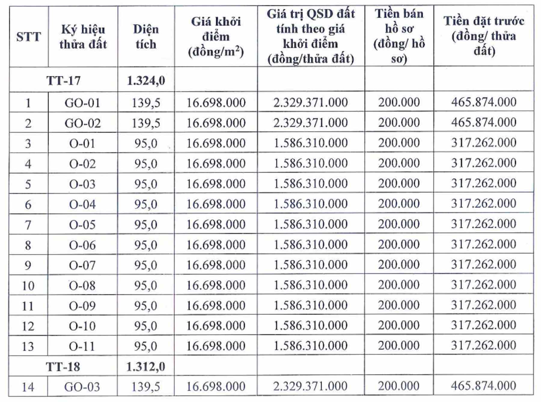 Các thửa đất có diện tích từ 89 - 139,5m2, giá khởi điểm là 16.698.000 đồng/m2. Bước giá áp dụng chung cho các thửa đất và vòng đấu là 3 triệu đồng/bước giá.