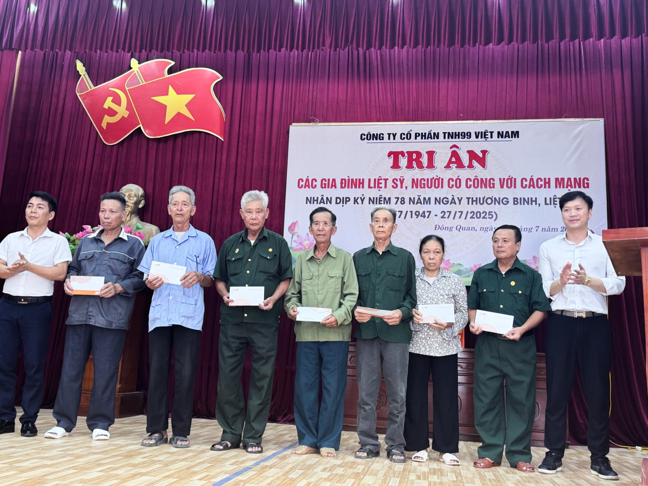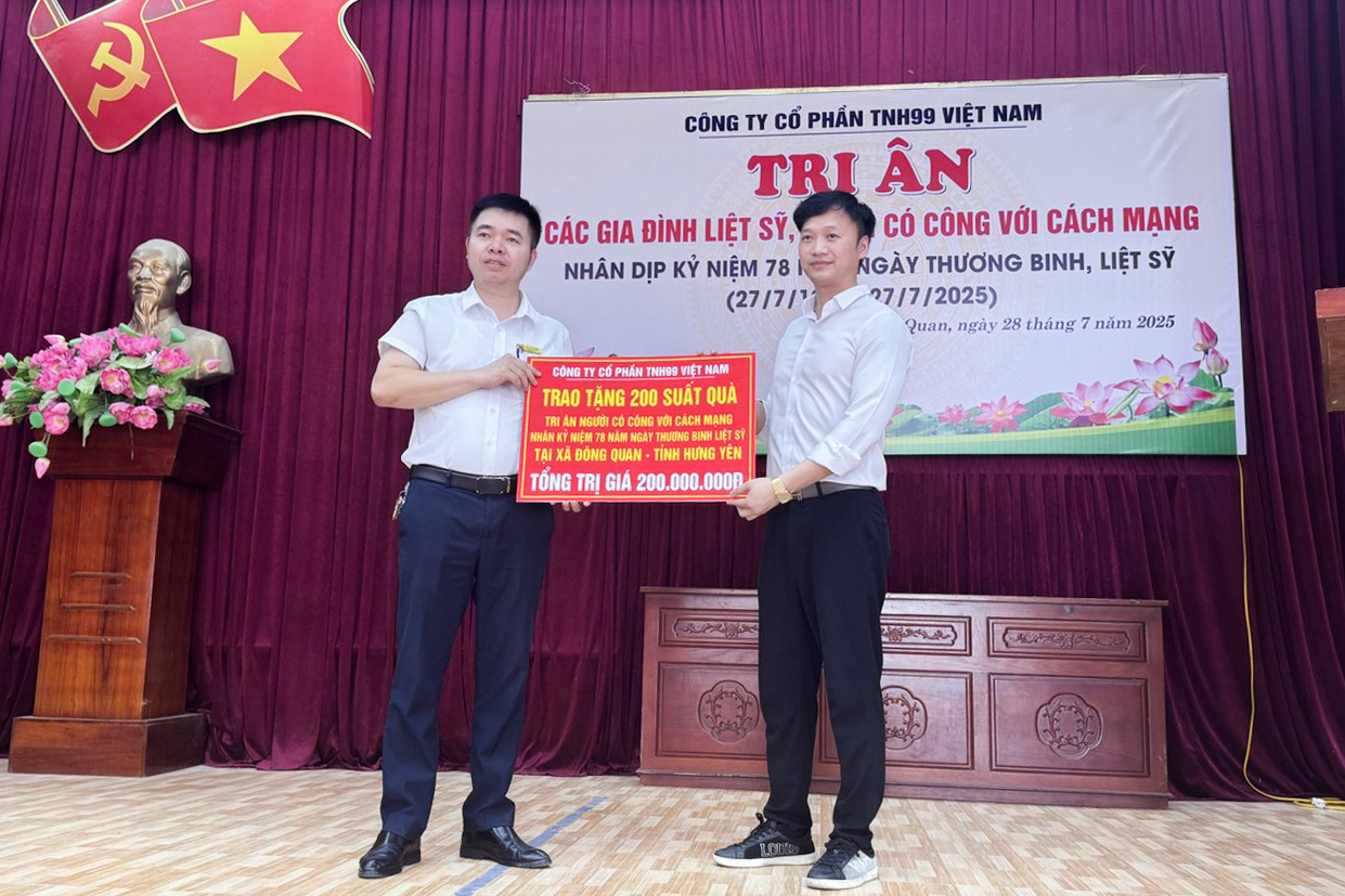 Trong không khí trang nghiêm và đầy xúc động nhân dịp kỷ niệm 78 năm Ngày Thương binh - Liệt sỹ, Công ty cổ phần TNH99 Việt Nam phối hợp cùng UBND xã Đông Quan (tỉnh Hưng Yên) đã tổ chức chương trình trao quà tri ân các thương binh, bệnh binh, thân nhân liệt sỹ và người có công với cách mạng trên địa bàn xã.