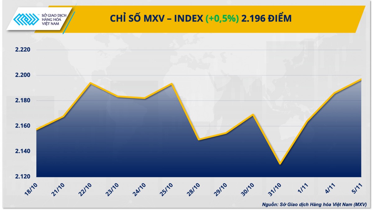 Đóng cửa, chỉ số MXV-Index tăng 0,5 % lên 2.196 điểm. Đáng chú ý, thị trường kim loại ghi nhận phiên khởi sắc khi có 9 trên 10 mặt hàng đồng loạt tăng giá trong ngày bầu cử Tổng thống Mỹ và bối cảnh thị trường kỳ vọng vào gói kích thích tài khóa quy mô lớn của Trung Quốc. Bên cạnh đó, trên thị trường năng lượng, giá dầu WTI phục hồi trước lo ngại bão Rafael có thể ảnh hưởng đến sản lượng tại Vịnh Mexico.