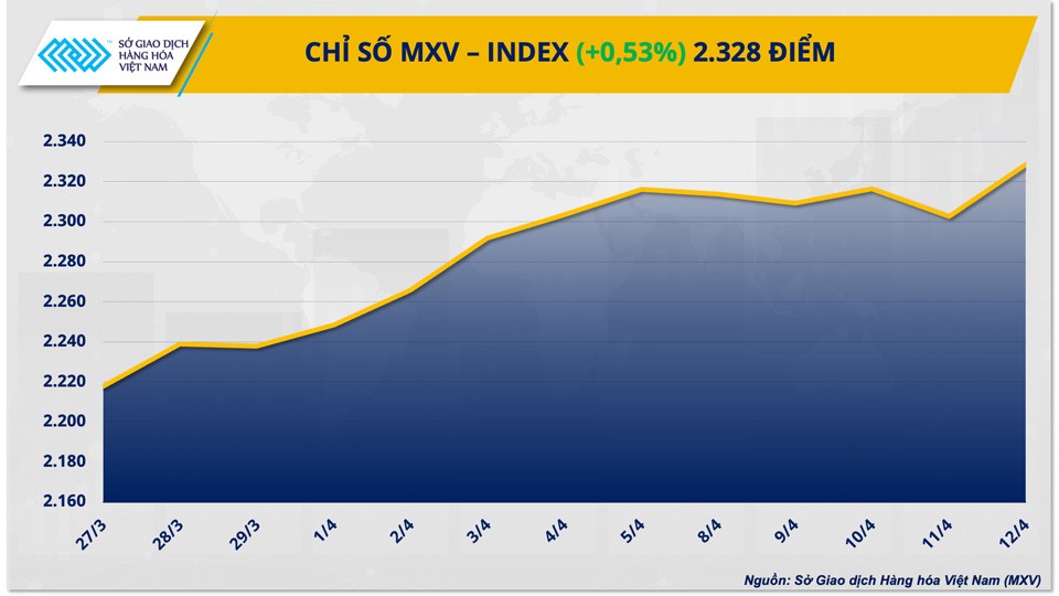 Số liệu từ Sở Giao dịch Hàng hóa Việt Nam (MXV) cho thấy, thị trường hàng hóa nguyên liệu đóng cửa tuần qua (8/4-12/4) với diễn biến phân hoá.