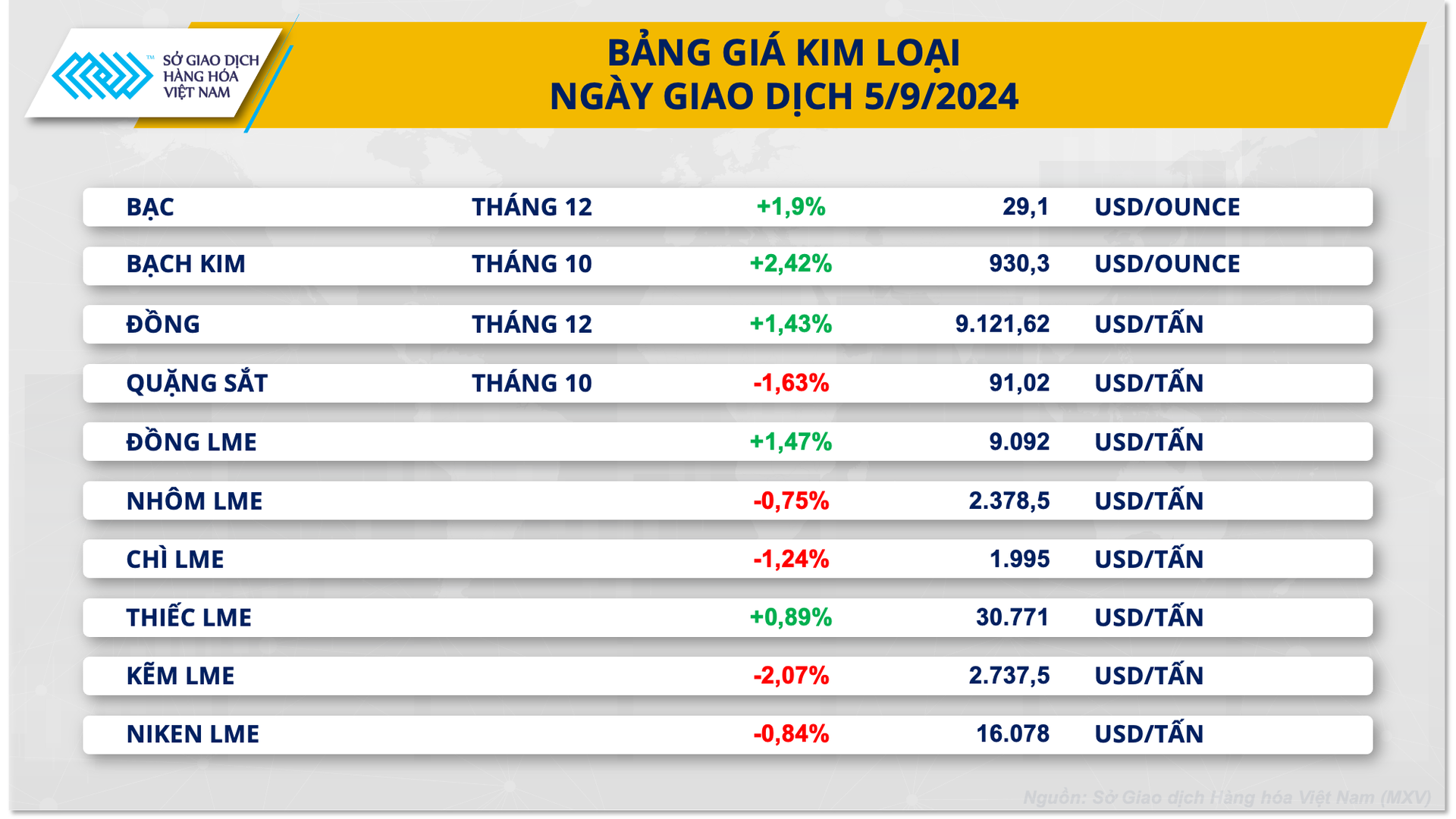 Bảng giá kim loại ngày 5-9. Nguồn: MXV