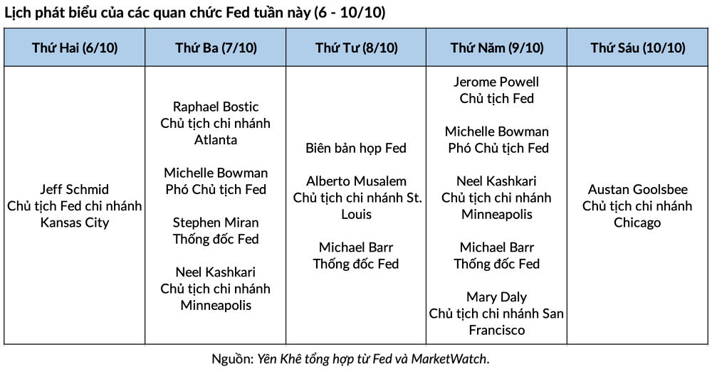 Ngoài biên bản cuộc họp tháng 9, một loạt quan chức Fed sẽ có các bài phát biểu công khai trong tuần này. Các nhà đầu tư sẽ chú ý đến bình luận từ các nhà hoạch định chính sách nhằm phán đoán hướng đi của Fed tại cuộc họp vào cuối tháng.