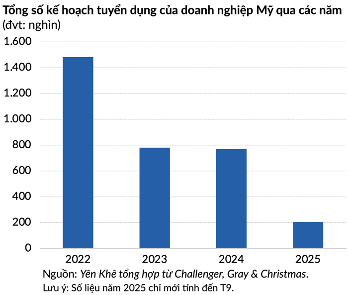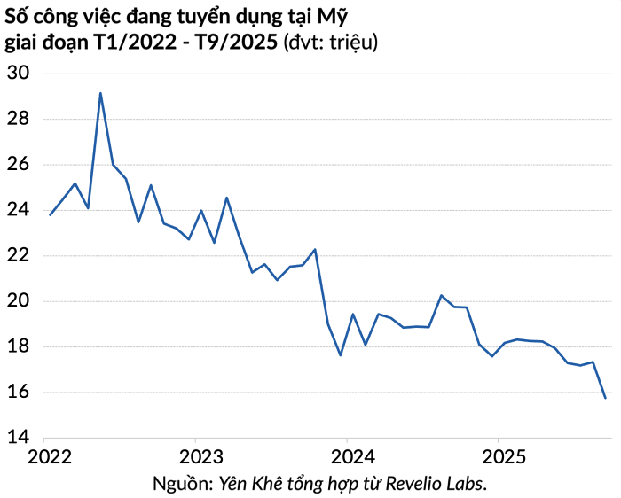 Ngoài ra, theo công ty nghiên cứu thị trường lao động Revelio Labs, số lượng công việc đang tuyển dụng tại Mỹ đã giảm khoảng 17% so với cùng kỳ năm ngoái vào tháng 9.