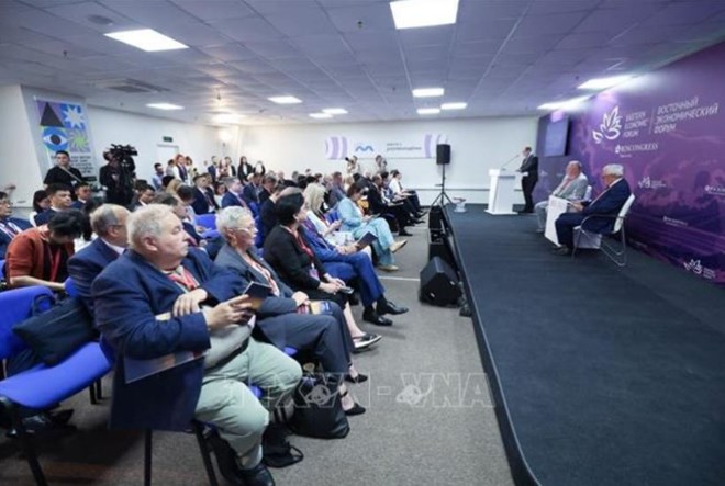 Các đại biểu dự hội thảo khoa học hướng tới kỷ niệm 75 năm thiết lập quan hệ ngoại giao giữa Việt Nam và Nga trong khuôn khổ Diễn đàn Kinh tế Phương Đông lần thứ 9. Ảnh TTXVN