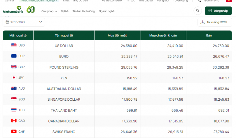 Tỷ giá đô la Úc hôm nay 27/10/2023 tại Ngân hàng Vietcombank, ảnh chụp website màn hình |