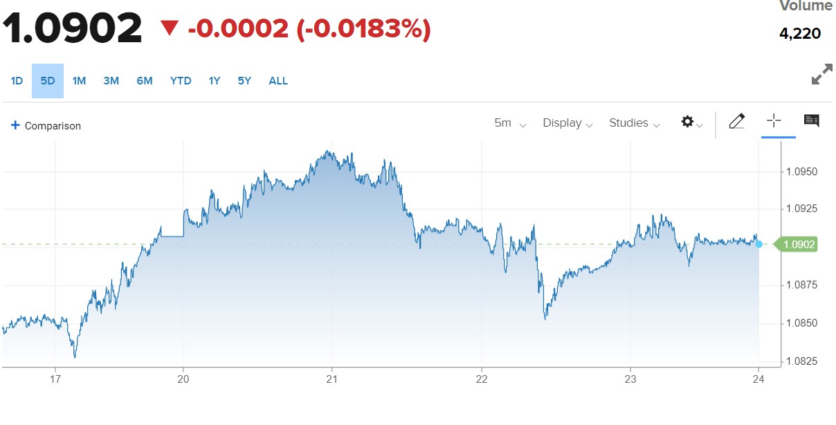 | Diễn biến tỷ giá EUR/USD trên thị trường thế giới (Nguồn: CNBC) |