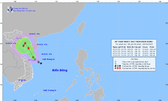 Cập nhật từ Trung tâm Dự báo Khí tượng Thuỷ văn Quốc gia, hồi 7 giờ ngày 18.10, vị trí tâm áp thấp nhiệt đới ở vào khoảng 16,7 độ vĩ bắc; 109,4 độ kinh đông, cách quần đảo Hoàng Sa khoảng 240km về phía tây tây bắc, cách đất liền khu vực Quảng Trị - Quảng Ngãi khoảng 170km về phía đông.