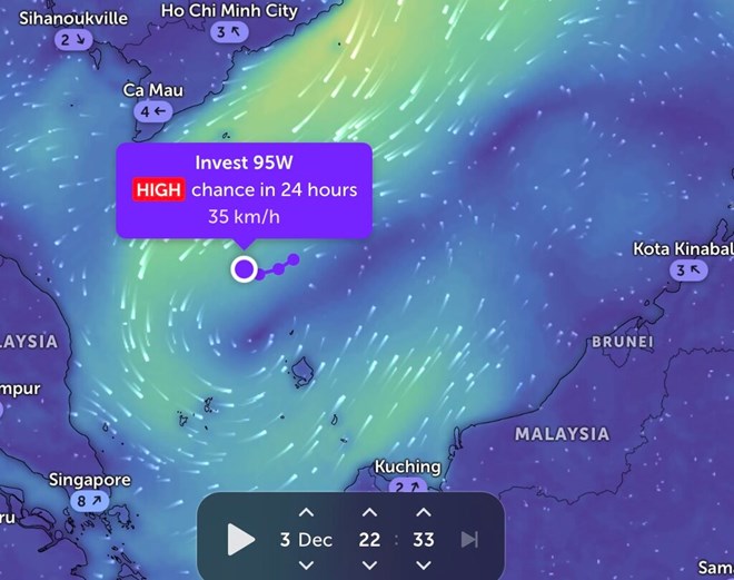 Các nhà dự báo bão của JTWC nhận định ngày 3.12 rằng áp thấp Invest 95W có khả năng mạnh lên thành bão trong vòng 24 giờ tiếp theo.