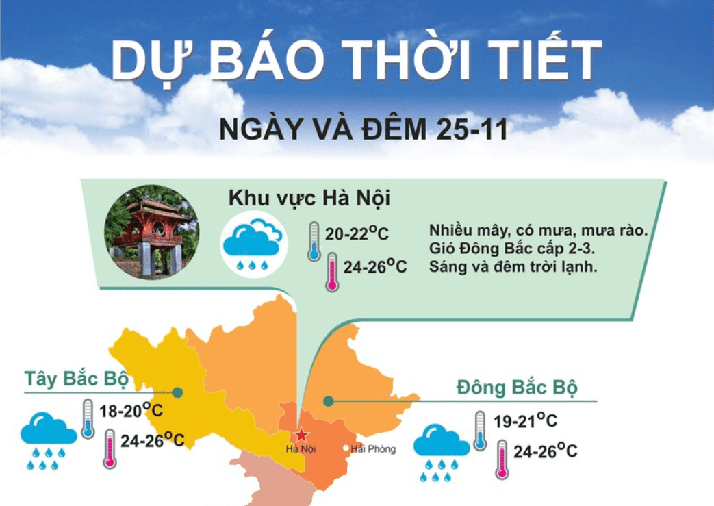 Dưới tác động của gió Đông Bắc kết hợp hội tụ gió trên cao, ở Bắc Bộ và Thanh Hóa hôm nay (25-11) trời vẫn nhiều mây, ngày có mưa nhỏ, mưa phùn và sương mù. Riêng khu vực vùng núi Bắc Bộ và Bắc Trung Bộ cục bộ có mưa to. Đêm và sáng trời lạnh.