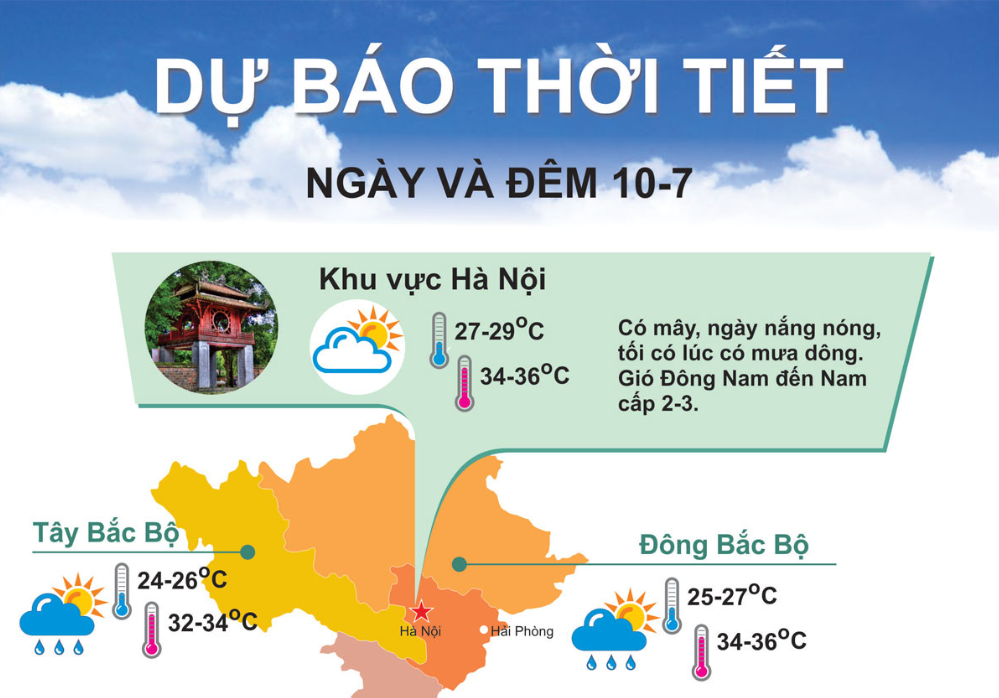 Hôm nay 10-7, khu vực Đồng bằng Bắc Bộ, phía Nam Sơn La và Hòa Bình có nắng nóng diện rộng với nhiệt độ cao nhất phổ biến ở mức 34-36 độ C. Chiều tối có...