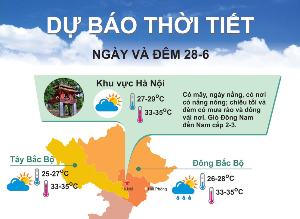 Hôm nay 28-6, khu vực Bắc Bộ ngày nắng, có nơi nắng nóng; chiều tối và đêm có mưa rào và dông vài nơi.