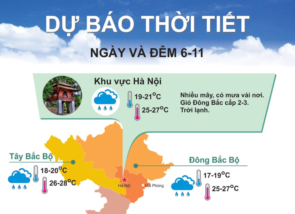 Do ảnh hưởng của không khí lạnh tăng cường, các tỉnh Đông Bắc Bộ và Bắc Trung Bộ trời nhiều mây và có mưa nhỏ, đêm và sáng sớm trời rét với nhiệt độ thấp nhất 18-20 độ C, vùng núi nhiều nơi dưới 17 độ C.