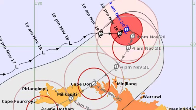 Sau đó, cơn bão sẽ càn quét quần đảo Tiwi và ở lại phía bắc Darwin, gây gió mạnh trong 24 giờ từ giữa trưa 22.11 đến giữa trưa 23.11.
